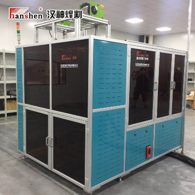 設(shè)備由機(jī)器人自動(dòng)上下料系統(tǒng)、視覺(jué)掃碼識(shí)別系統(tǒng)、激光焊接系統(tǒng)、煙塵凈化系統(tǒng)、水冷系統(tǒng)、耐壓測(cè)試檢測(cè)系統(tǒng)、不合格品挑揀分離系統(tǒng)等;