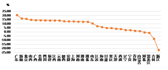 從各地區(qū)建筑業(yè)總產(chǎn)值增長情況看,有 27 個地區(qū)的建筑業(yè)總產(chǎn)值較上年同期有不同幅度的增長。其中,廣東、新疆、北京的增幅均超過 15%。有 4個地區(qū)出現(xiàn)負(fù)增長,其中,浙江出現(xiàn)了 超過20% 的負(fù)增長(圖 2)。